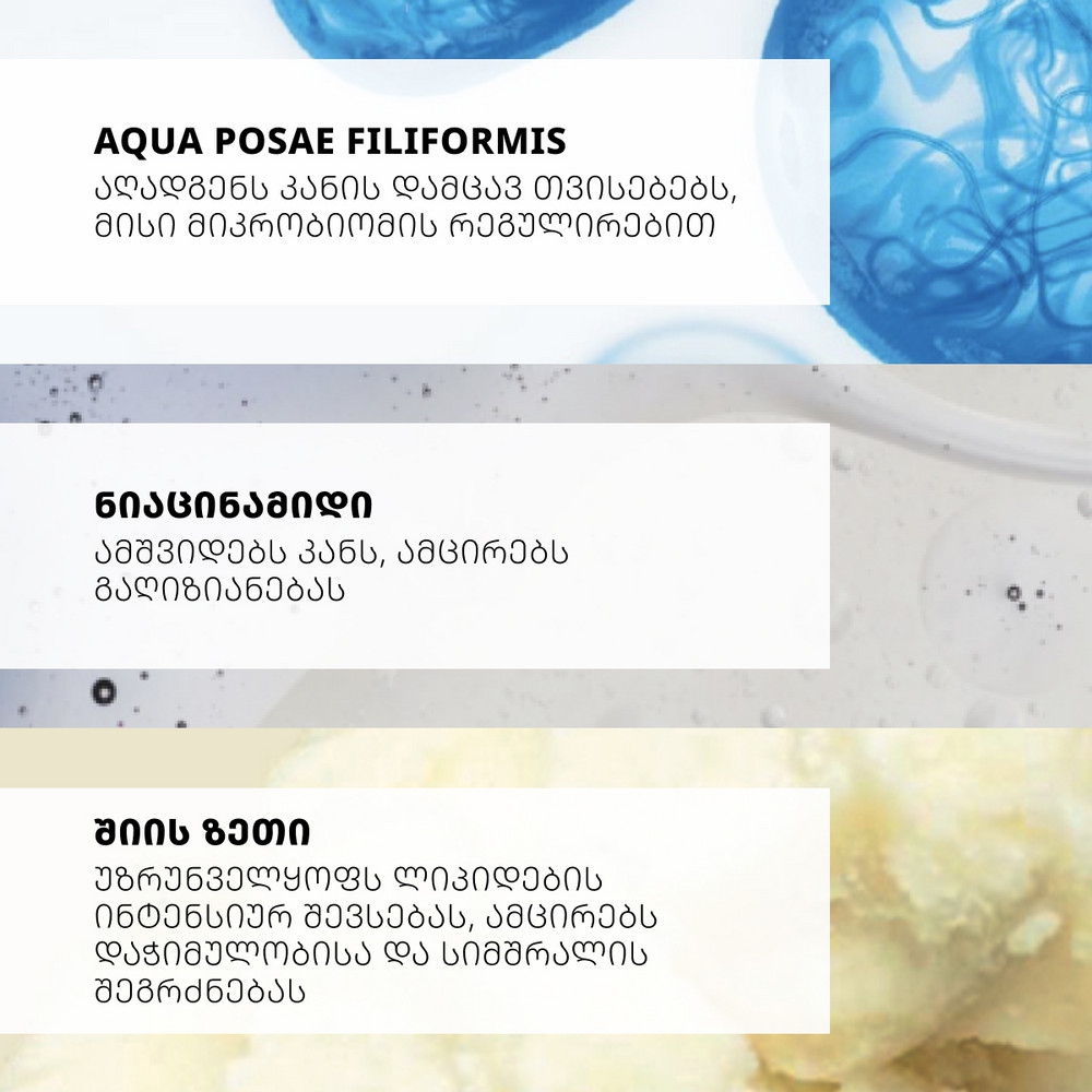 უნიკალური დაპატენტებული ინგრედიენტი ხელს უწყობს კანის მიკრობიომის აღდგენას და აძლიერებს მის დამცავ ბარიერს. ფორმულაში შემავალი ნიაცინამიდი ამშვიდებს ეპიდერმისს, ამცირებს გაღიზიანებას და ანიჭებს კომფორტის შეგრძნებას. შიის ზეთ ხელს უშლის ამცირებს სიმშრალისა და დაჭიმულობის შეგრძნებას. არ აღიზიანებს თვალებს თმის დასაბანად გამოყენებისას. რეკომენდირებულია ჩვილებისთვის, ბავშვებისთვის და მოზრდილებისთვის. ტესტირებულია დერმატოლოგიური და პედიატრებული მეთვალყურეობის ქვეშ. არ შეიცავს საპონს, პარაბენებს, ეთილის სპირტს. აქვს დახვეწილი, დელიკატური არომატი ფორთოხლის და თეთრი ყვავილების ნოტებით.