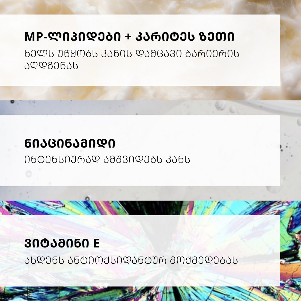 აქვს მდიდარი ტექსტურა, რომელიც ინტენსიურად აღადგენს ეპიდერმისის ზედა ფენებს. ახალი თაობის MP ლიპიდები და კარიტეს ზეთი დადასტურებული მოქმედებით გავლენას ახდენს კანის დაცვისთვის აუცილებელი დამატენიანებელი კომპონენტების სინთეზზე. ფორმულაში შემვალი შიის კარაქი აძლიერებს დამცავ ფუნქციას, უბრუნებს ეპიდერმისს კომფორტს და სირბილეს. ვიტამინი E უზრუნველყოფს ანტიოქსიდანტურ მოქმედებას. ნიაცინამიდს გააჩნია ანთების საწინააღმდეგო ეფექტი. აქვს სასიამოვნო სურნელი, რომელიც გაჯერებულია ციტრუსისა და ყვავილების ნოტებით.