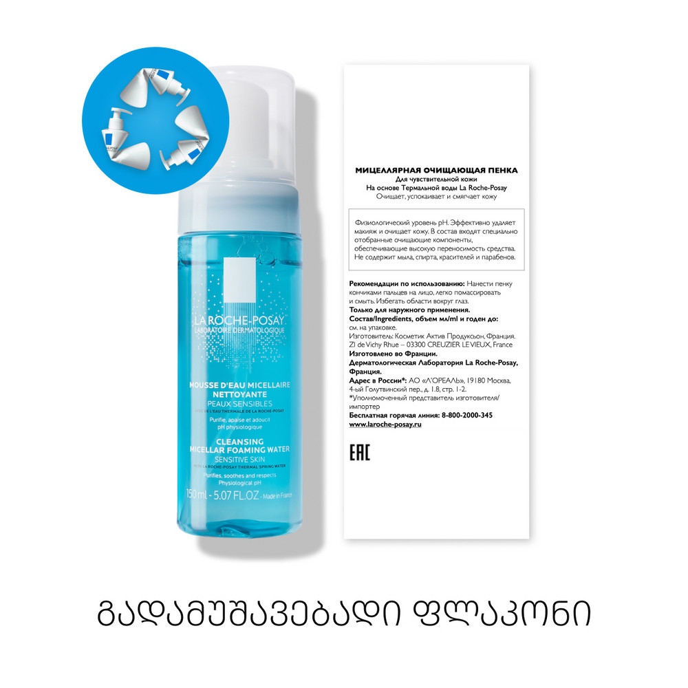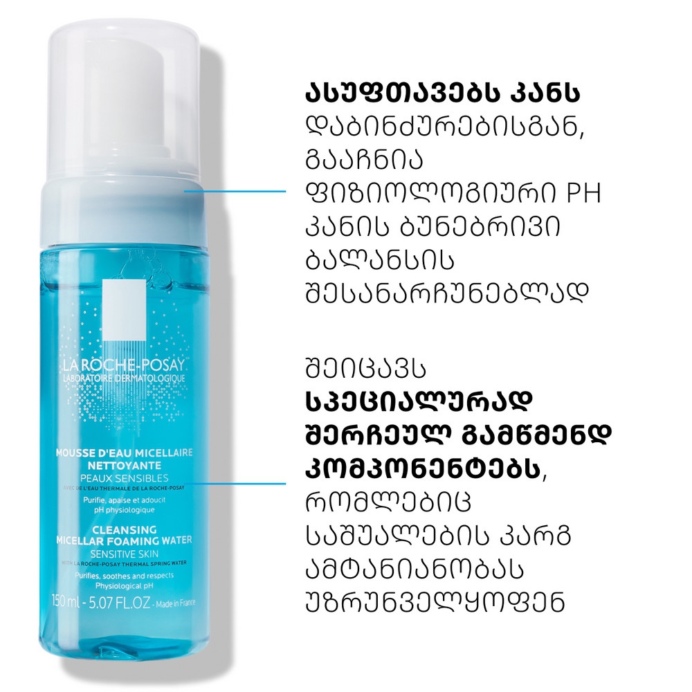 მიცელარული ქაფი ნაზად ასუფთავებს კანს მინარევებისაგან, ატენიანებს, ამშვიდებს და არბილებს მას. ქაფი დაფუძნებულია LA ROCHE-POSAY თერმულ წყალზე და შეიცავს სპეციალურ გამწმენდ ინგრედიენტებს, რომელებიც უნარჩუნებს ეპიდერმისს ბუნებრივ ბალანსს. ხელს უშლის სიმშრალეს და უზრუნველოყს ტენიანობის ოპტიმალური დონის შენარჩუნებას. არის ჰიპოალერგიული და არ შეიცავს ალკოჰოლს.