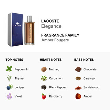Discover the sophisticated scent of Lacoste Elegance, a robust men's fragrance introduced by the renowned design house of Lacoste in 2007. This compelling perfume is a perfect blend of aromatic and spicy notes, crafted for the modern man who values style and refinement.