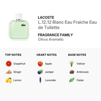 Whether you're headed to the office, a casual lunch, or a formal event, the Lacoste Men's L.12.12 Blanc Eau Fraiche Eau de Toilette will complement your ensemble perfectly, leaving a trail of allure and confidence. With its unique blend of citrus, aromatic, and woodsy notes, this fragrance is sure to become a staple in your personal collection. Experience the sophistication and freshness of L.12.12 Blanc Eau Fraiche Eau de Toilette by Lacoste - a scent that marks every moment with significance.