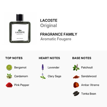 As you first experience the Lacoste Men's Original, you'll be greeted by invigorating top notes of Bergamot, Cardamom, and Pink Pepper. These fresh and spicy notes create an immediate impression of energy and confidence. Moving into the heart of the fragrance, the blend of Lavender and Clary Sage adds a soothing and aromatic touch, elevating the overall complexity and depth.