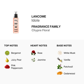 Idole opens with the zesty freshness of top notes of bergamot, perfectly balanced by the sweet succulence of juicy pear and the zingy aroma of pink peppercorn. This invigorating opening paves the way for the heart notes, a sensual blend of rose and jasmine. These floral notes weave a romantic narrative that adds a dash of femininity to the fragrance.