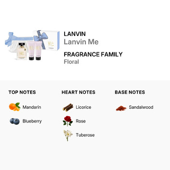 Lanvin Me opens with top notes of juicy mandarin and sweet blueberry, creating a bright and inviting first impression. The heart reveals a unique blend of rose, tuberose, and a hint of licorice, adding depth and a touch of mystery to this feminine scent. Finally, warm sandalwood at the base leaves a lasting impression that is both soft and sophisticated.