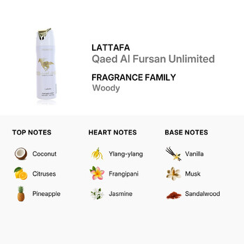 Step into a world of elegance and charm with Lattafa's Qaed Al Fursan Unlimited, a captivating 6.7 oz body spray crafted especially for ladies. Launched in 2022, this Middle Eastern fragrance from the United Arab Emirates blends exotic ingredients to create a scent that’s both bold and beautifully feminine.