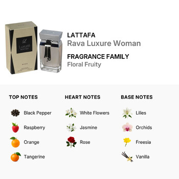 At the top, Rava Luxure Woman opens with a burst of black pepper, raspberry, orange, and tangerine, creating a lively and invigorating start. As the fragrance unfolds, the heart reveals a bouquet of white flowers, jasmine, and rose, adding a touch of timeless femininity. Finally, the base notes of lilies, orchids, freesia, vanilla, and patchouli provide a warm and sensual finish, ensuring the scent lingers beautifully on the skin.