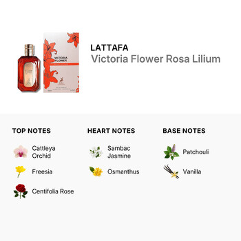 Experience pure elegance with Lattafa's Victoria Flower Rosa Lilium Eau de Parfum Spray for Ladies. Crafted by the renowned Middle Eastern fragrance house Lattafa, based in the United Arab Emirates, this luxurious 3.4 oz scent captures the essence of graceful femininity and timeless charm. Designed exclusively for women, Victoria Flower Rosa Lilium is a beautifully balanced fragrance that wraps you in a bouquet of captivating floral notes and soft, warm undertones.