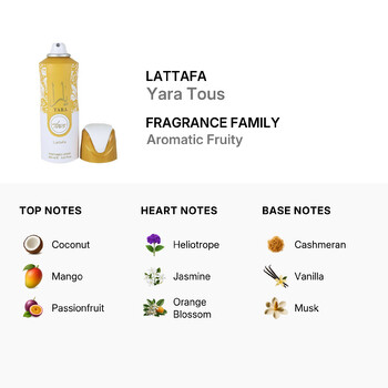 Indulge in the elegance and charm of Lattafa Yara Tous Body Spray. Please note that this item is available for shipping only within the Contiguous United States and Canada. Barcode: 6290360599427.