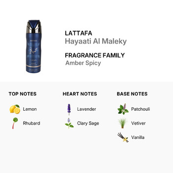 Hayaati Al Maleky opens with a vibrant burst of lemon and rhubarb, creating a fresh, zesty introduction that awakens the senses. As the scent settles, the heart reveals a soothing mix of lavender and clary sage for a balanced and masculine core. Finally, the base notes of patchouli, vetiver, and vanilla add a warm and earthy richness that brings depth and elegance to every spray.