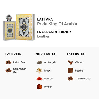 Unleash your inner royalty with Lattafa Pride King Of Arabia Eau de Parfum Spray for Men. Masterfully crafted in the United Arab Emirates, this 3.4 oz fragrance captures the powerful essence of Middle Eastern luxury. Made by the renowned design house Lattafa, this scent is a bold expression of strength, elegance, and confidence — perfect for men who lead with presence.