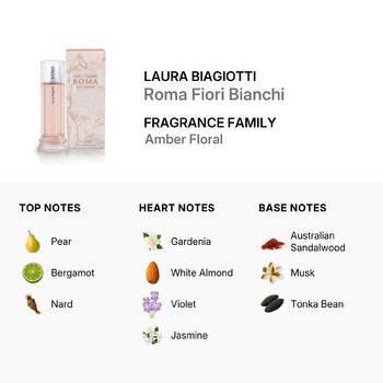 Roma Fiori Bianchi opens with a bright blend of pear, bergamot, and nard, creating a crisp and inviting first impression. As the fragrance unfolds, heart notes of gardenia, white almond, violet, and jasmine bloom with softness and elegance, adding a delicate yet captivating floral core. The base features warm Australian sandalwood, smooth musk, and sweet tonka bean, leaving a comforting and lasting trail.