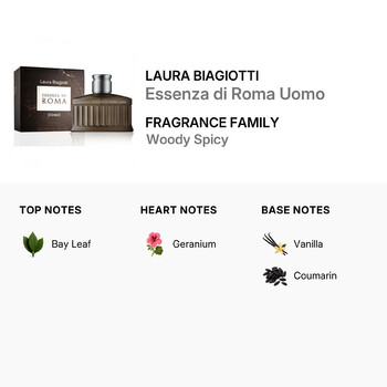 Essenza di Roma Uomo belongs to the Woody Spicy fragrance family, offering a rich and warm aroma that leaves a lasting impression. The top note opens with a fresh burst of bay leaf, setting the tone with a crisp, green spice. At the heart, the scent unfolds into aromatic geranium, adding an earthy floral twist that deepens the character. Finally, smooth base notes of vanilla and coumarin create a soft, comforting finish that lingers throughout the day.