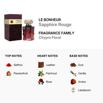 Belonging to the Chypre Floral family, Sapphire Rouge opens with a vibrant burst of saffron and juicy passionfruit, creating an instantly intriguing top layer. As the scent unfolds, a heart of smooth leather, earthy patchouli, and romantic rose reveals itself, adding warmth and depth. Finally, the base notes settle into a rich harmony of oud, creamy vanilla, golden amber, and labdanum, leaving a lasting impression that's both mysterious and magnetic.