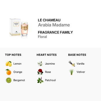 Immerse yourself in the captivating allure of Arabia Madame, an enchanting perfume for ladies by the renowned design house, Le Chameau. This exquisite EDP, sized at 3.4 oz, is a harmonious blend of top, heart, and base notes, meticulously crafted to create a fragrance experience like no other.