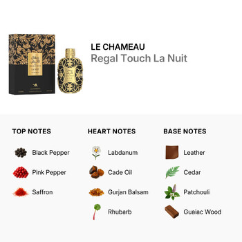 Regal Touch La Nuit opens with a vibrant burst of black pepper, pink pepper, and saffron. These top notes create a spicy and energetic introduction that grabs attention and awakens the senses. As the fragrance evolves, heart notes of labdanum, cade oil, gurjan balsam, and rhubarb add a smoky, balsamic richness with a touch of tart sweetness, giving the scent a mysterious and layered personality.