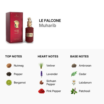 Le Falcone, known for its refined Middle Eastern fragrances, brings artistry and elegance to every bottle. Muharib’s sleek design and luxurious scent profile make it an ideal choice for day or night, whether at work or a special evening out.