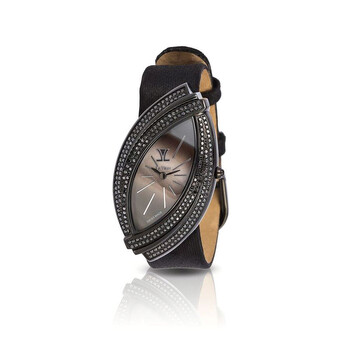 Black stainless steel case with a black satin strap. Fixed black bezel with blackberry diamond set stainless steel. Chocolate dial with black hands and index hour markers. Dial Type: Analog. Quartz movement. Unique case shape, case size: 27 mm. Buckle clasp. Functions: hour, minute. Additional Info: 2 1/5 cts. blackberry diamond. Katana Series. Fashion watch style. Watch label: Swiss Made. Le Vian Katana Quartz Diamond Ladies Watch LV135BSMOP.