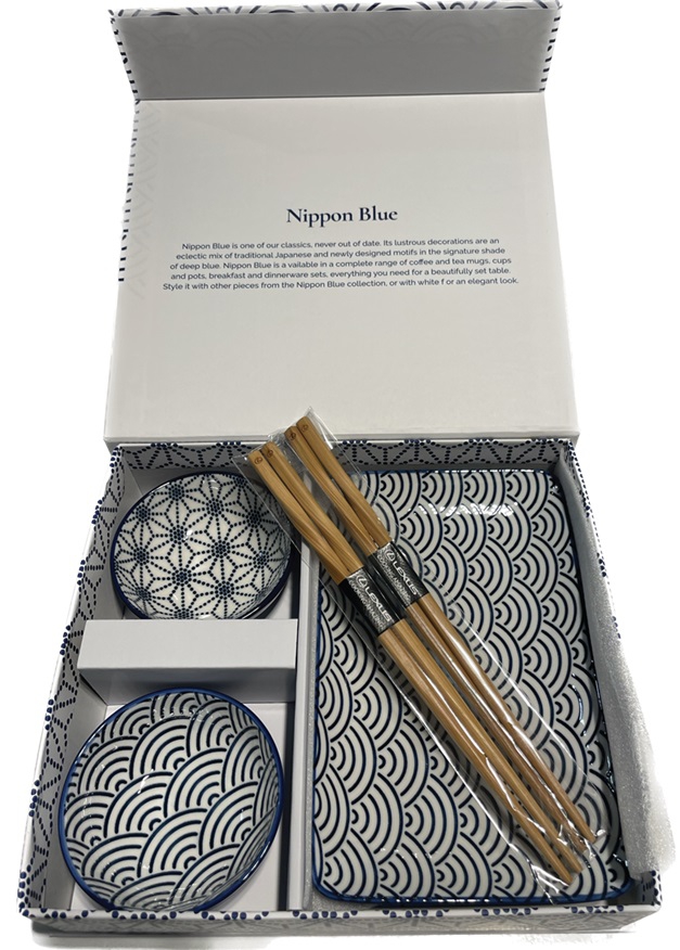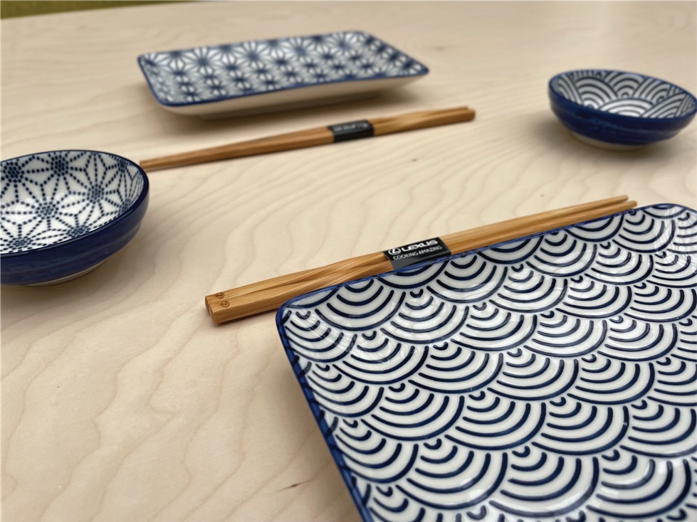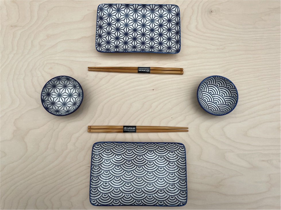 - სუშის ნაკრები შეიცავს: 2 თასი, 2 თეფში, ჯოხების 2 კომპლექტი
