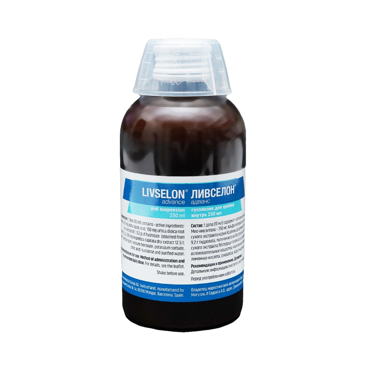ლივსელონი ადვანსი არის გაუმჭვირვალე, ყავისფერი დამახასიათებელი სუნის მქონე სითხე. შეფუთვის ზომები: 250 მლ ბოთლი.