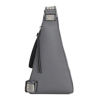 Loewe Men's Belt Bag. SKU: B511A09X10.1640. Barcode: 8445555158882. Color: Asphalt Grey. Size: Height 34cm x Width 17.5cm x Depth 13cm. Loewe Anton Calfskin Sling In Asphalt Grey. The LOEWE Anton Sling Bag is a sleek accessory crafted from supple smooth calfskin leather. It features a single adjustable strap for versatile wear and a zip-top design that folds over when in use, securing with a snap button. The bag includes a calfskin zip pull, herringbone cotton canvas lining, and an embossed Anagram logo on the front. Main material: Supple Smooth Calf/Jacquard. Made in Spain.