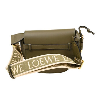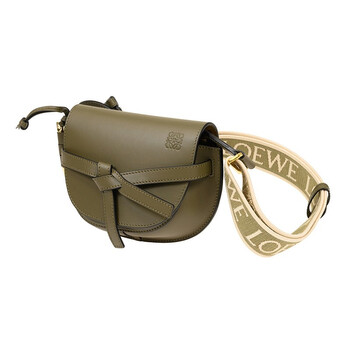 Loewe Ladies Crossbody. SKU: A650N46X13.4357. Color: Autumn Green. The Gate Dual is a compact bag with a signature knot and a side-latched metal pin that gives it its name. This mini version is crafted in soft calfskin. Shoulder, crossbody, sling or belt carry Detachable and adjustable calfskin and jacquard strap Belt fastening Two internal slip pockets Gold suede lining Embossed Anagram. Made in Spain.