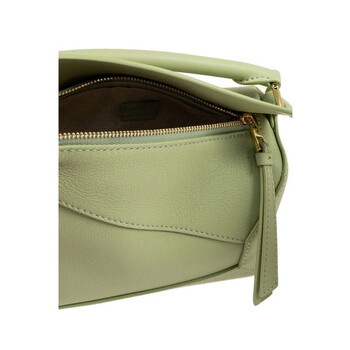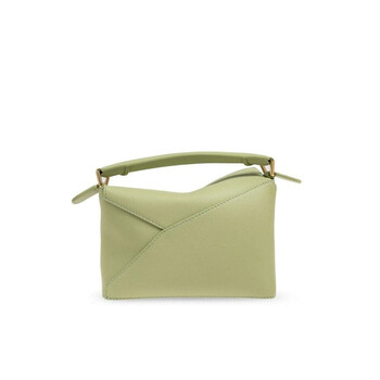 Loewe Ladies Crossbody. SKU: A510P88X26.3916. Barcode: 8445555545842. Color: Light Pear. Size: H: 4.9" x W: 7.1" x D: 3.1". Loewe Classic Calfskin Mini Puzzle Bag - Light Pear. The Loewe mini puzzle bag is crafted in calfskin leather with a herringbone cotton canvas lining and a gold-tone hardware. It features a zip closure with calfskin pull, embossed Anagram, removable and adjustable strap for shoulder or crossbody wear and a main compartment. Made in Spain.