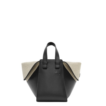 Loewe Ladies Handbag. SKU: A538H42X01.1100. Color: Black. Size: D:25cm x H:21cm x W:14.5cm. Loewe Compact Calfskin Hammock Bag. This hammock bag features a detachable and adjustable strap, an interior hook, a concealed magnetic side closure, one external zipped pocket, two internal slip pockets, and an embossed Anagram design. 100% Calfskin. Made in Spain.