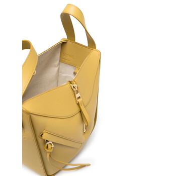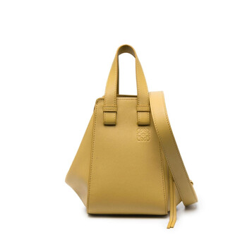 Loewe Ladies Handbag. SKU: A538H13X10.6048. Barcode: 8445555260882. Color: Bright Ochre. Size: Height 20.8 cm x Width 14.4 cm x Depth 19.5 cm. Loewe Compact Hammock Bag In Bright Ochre. Crafted from satin calfskin, the Compact Hammock bag features supple side panels that expand to alter its shape. It has dual top handles and a detachable, adjustable jacquard tonal strap. The bag is designed with an internal hook closure, an external zip pocket, and two internal slip pockets. Lined with herringbone cotton canvas, it is finished with an embossed Anagram. Main material: Satin Calf Leather. Made in Spain.
