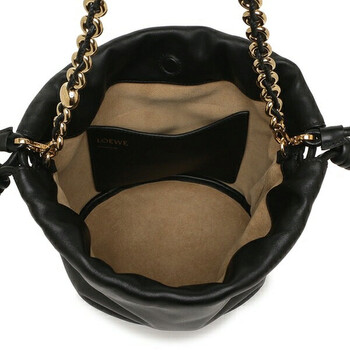 Loewe Ladies Bucket Bag. Paula's IBIZA series. SKU: A411FPBX021100. Barcode: 8445555418443. Color: Black. Size: Height 24cm x Width 32 cm x Depth 17 cm. Loewe Flamenco Purse Bucket Bag - Black. The Flamenco Purse is crafted from soft nappa lambskin and features a detachable and adjustable leather strap, along with a detachable donut chain adorned with an Anagram Pebble. It has a discreet magnetic closure, suede lining, and a spacious main compartment. The purse showcases a ruched design, with the signature knots at the sides, adding a unique and elegant touch. Main material: Mellow Nappa Lambskin. Made in Spain.