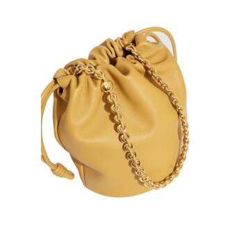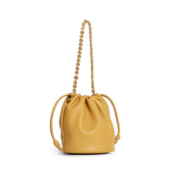 Loewe Ladies Bucket Bag. SKU: A411FPBX02.6715. Barcode: 8445555418429. Color: Sahara. Size: Height 24cm x Width 32 cm x Depth 17 cm. Loewe Flamenco Purse Bucket Bag in Sahara. The Flamenco Purse is crafted from soft nappa lambskin and features a detachable and adjustable leather strap, along with a detachable donut chain adorned with an Anagram Pebble. It has a discreet magnetic closure, suede lining, and a spacious main compartment. The purse showcases a ruched design, with the signature knots at the sides, adding a unique and elegant touch. Main material: Mellow Nappa Lambskin. Made in Spain.