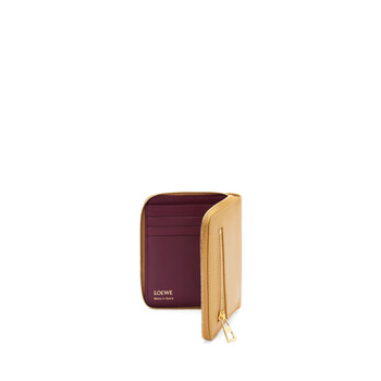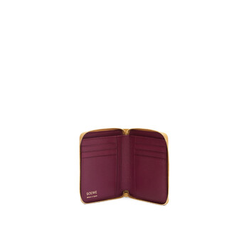 Loewe Ladies Wallets. SKU: CEM1CWZX01.6743. Barcode: 8445555456063. Color: Sahara/Crimson. Size: Height 9.5cm x Width 12.2cm x Depth 1.4cm. Loewe Knot Compact Zip Around Wallet - Sahara/Crimson. Crafted from shiny nappa calfskin, this wallet features a contrasting knot zip pull, six card slots, four slip pockets, one large note pocket, and a zipped coin compartment at the back. It is lined with contrast calfskin and finished with a gold-embossed LOEWE logo. Main material: Shiny Nappa Calf Leather. Made in Spain.