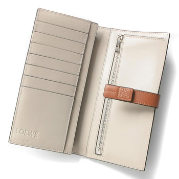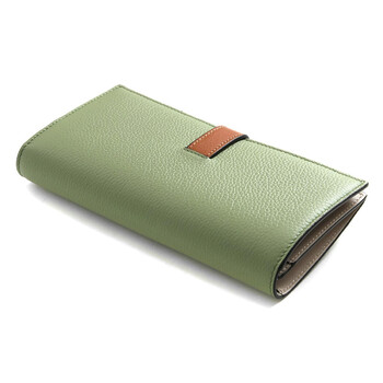 Loewe Ladies Wallets. SKU: C660S40X01.6465. Barcode: 8432902933308. Color: Rosemary/Tan. Size: Height 17.5cm x Width 9cm x Depth 2cm. Loewe Large Vertical Wallet - Rosemary/Tan. Crafted from soft grained calfskin, this wallet features contrasting colors. It includes seven card slots, two slip pockets, one larger pocket, a zipped coin compartment, and a snap button closure. Finished with calfskin lining and embossed Anagram. Main material: Soft Grained Calf Leather. Made in Spain.