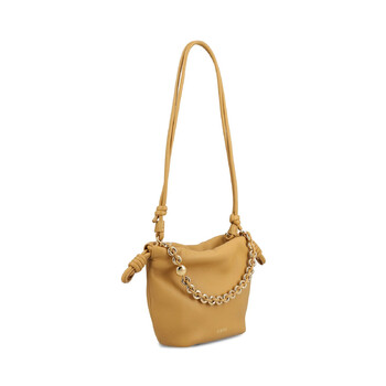 Loewe Ladies Crossbody. SKU: A914CBPX03.6715. Color: Sahara. Size: H 6.7" x W 9.1" x D 2.2". Loewe Nappa Mini Flamenco Crossbody Bag. The Flamenco Purse, inspired by the Flamenco line’s ruched design, features signature side knots, a detachable donut chain with an Anagram Pebble, and can be worn as a shoulder, crossbody, or hand carry with an adjustable leather strap, discreet magnetic closure, and suede lining. Material: Mellow Nappa Lambskin. Made in Spain.