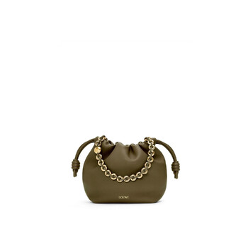 Loewe Ladies Crossbody. SKU: A914CBPX03.3969. Color: Dark Khaki Green. Size: H 6.7" x W 9.1" x D 2.2". Loewe Nappa Mini Flamenco Crossbody Bag. The Flamenco Purse, inspired by the Flamenco line’s ruched design, features signature side knots, a detachable donut chain with an Anagram Pebble, and can be worn as a shoulder, crossbody, or hand carry with an adjustable leather strap, discreet magnetic closure, and suede lining. Material: Mellow Nappa Lambskin. Made in Spain.