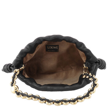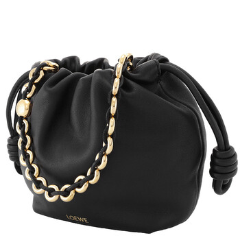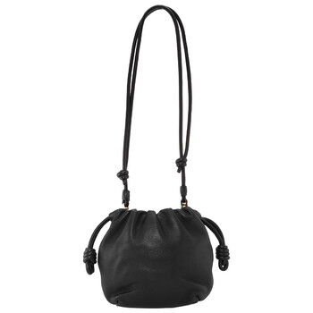 Loewe Ladies Crossbody. SKU: A914CBPX03.1100. Color: Black. Size: H 6.7" x W 9.1" x D 2.2". Loewe Nappa Mini Flamenco Crossbody Bag. The Flamenco Purse, inspired by the Flamenco line’s ruched design, features signature side knots, a detachable donut chain with an Anagram Pebble, and can be worn as a shoulder, crossbody, or hand carry with an adjustable leather strap, discreet magnetic closure, and suede lining. Material: Mellow Nappa Lambskin. Made in Spain.