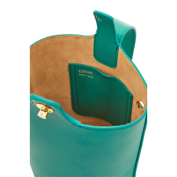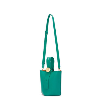 Loewe Ladies Bucket Bag. SKU: AANBBBMX01.7831. Barcode: 8445555399377. Color: Emerald Green. Size: W 16 x H 19.5 x D 16 cm. Loewe Pebble Mini Buckle Bag- Emerald Green. The 'Pebble' mini leather bucket bag features an adjustable handle with a maxi metal button detail, a removable and adjustable shoulder strap, and a magnetic closure. It includes a main compartment with a slip pocket, suede lining, and is finished with gold-toned hardware. 100% calfskin leather. Made in Spain.