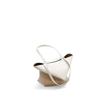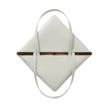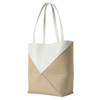Loewe Ladies Tote. SKU: A779G50X18.8487. Barcode: 8445555336686. Color: Soft White/Paper Craft. Size: Height 31.5cm x Width 25.5cm x Depth 14.5cm. Loewe Shiny Calfskin Puzzle Fold Tote - Soft White/Paper Craft. Crafted from shiny nappa calfskin, this tote bag boasts a soft, lightweight design with graphic and architectural panels. It features a main compartment with suede lining, dual top handles, and is finished with an embossed LOEWE logo on the front. Main material : Shiny Calf Leather. Made in Spain.