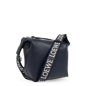 Loewe Men's Crossbody. SKU: B906Q63X04.5544. Barcode: 8445555453857. Color: Deep Navy. Size: Height 22 cm x Width 29.5 cm x Depth 10.5 cm. Loewe Small Cubi Crossbody Bag. Crafted from soft, smooth calfskin, the Small Cubi crossbody bag features an adjustable crossbody strap and an additional adjustable LOEWE jacquard strap. It has a zip closure with a calfskin pull, an internal slip pocket, and is lined with herringbone cotton canvas. The bag is finished with an embossed Anagram logo for a signature touch.