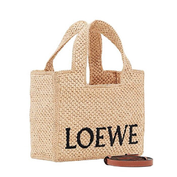 Loewe Ladies Shopping Bag. Paula's IBIZA series. SKU: A685B59X032123. Color: Beige. Size: 7.68" x 9.45" x 4.33". LOEWE Tote Bag with Font Logo. The bag features a front graphic logo, an adjustable and removable shoulder strap, and handles. A protective bag is included. It is made from 72% raffia, 20% calf leather, and 8% viscose, and is crafted in Spain.