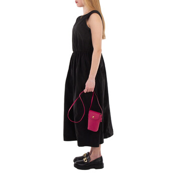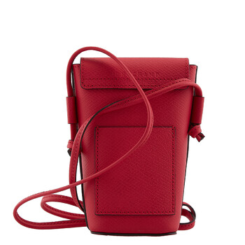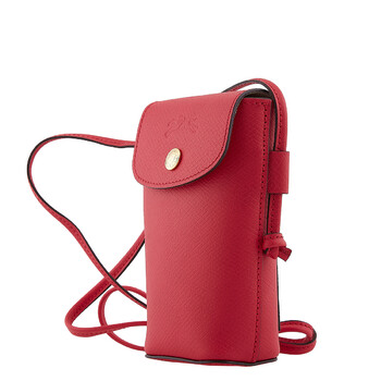 Longchamp Ladies Crossbody. SKU: 34193HYZJ13. Color: Magenta. Size: 3.3 in (L) x 6.7 in (H) x 2.2 in (W). Longchamp Epure Phone Case With Leather Strap. The Epure Phone Case features a snap fastening, crafted from Russian leather (cowhide) with gold-colored metallic hardware, and lined with a recycled jacquard blend of polyamide and polyester, showcasing an all-over LGP design, with a main compartment. Material : Russian leather (cowhide).