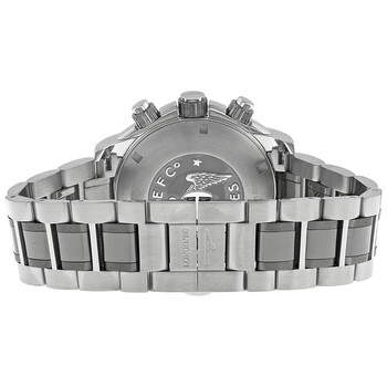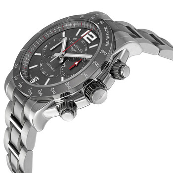 Stainless steel case with a stainless steel and grey ceramic bracelet. Ceramic uni-directional rotating with tachymeter bezel. Grey dial with red and silver-tone hands and index hour markers. Arabic numeral marks the 12 o'clock position. minute markers around the outer rim. Dial Type: Analog. Luminescent hands and markers. Date display at the 6 o'clock position. Chronograph - two sub-dials displaying: 60 second and 30 minute. Automatic movement. L705 engine. Scratch resistant sapphire crystal. Screw down crown. Solid case back. Case diameter: 42 mm. Case thickness: 15.3 mm. Round case shape. Band width: 20 mm. Deployment with push button clasp. Water resistant at 100 meters / 330 feet. Functions: chronograph, date, hour, minute, second, tachymeter. Luxury watch style. Watch label: Swiss Made. Longines Admiral Chronograph Automatic Grey Dial Men's Watch L3.667.4.06.7.