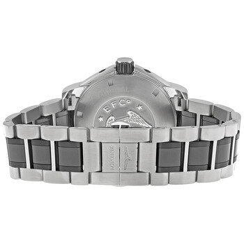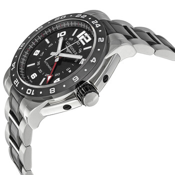 Stainless steel case with a stainless steel bracelet with black ceramic links. Fixed ceramic bezel marked with 24 hours. Black dial with silver-tone hands and alternating index and Arabic numeral hour markers. Minute markers around the outer rim. Dial Type: Analog. Luminescent hands and markers. Date display at the 3 o'clock position. Automatic movement. Scratch resistant sapphire crystal. Screw down crown. Solid case back. Case diameter: 42 mm. Case thickness: 15.5 mm. Round case shape. Deployment clasp. Water resistant at 100 meters / 330 feet. Functions: GMT, date, 24 hour, second time zone, hour, minute, second. Luxury watch style. Watch label: Swiss Made. Longines Admiral GMT Black Dial Steel and Ceramic Men's Watch L3.669.4.56.7.