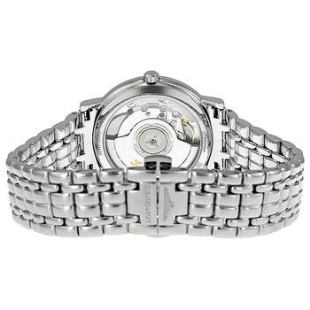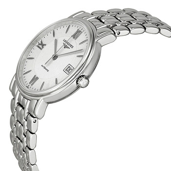 Stainless steel case with a stainless steel bracelet. Fixed Astainless steel bezel. Silver white dial with silver-tone hands and stick hour markers. Roman numerals mark the 6, 9 and 12 o'clock positions. Minute markers around the outer rim. Dial Type: Analog. Date display at the 3 o'clock position. Automatic movement. Scratch resistant sapphire crystal. Pull / push crown. Skeleton case back. Case diameter: 34 mm. Case thickness: 7.5 mm. Round case shape. Band width: 18 mm. Deployment clasp with push button. Water resistant at 30 meters / 100 feet. Functions: date, hour, minute, second. Dress watch style. Watch label: Swiss Made. Longines Automatic Silver White Dial Stainless Steel Ladies Watch L48214156.