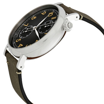 Silver-tone stainless steel case with a black distressed leather strap. Fixed silver-tone stainless steel bezel. Black grained dial with silver-tone leaf-style shape hands and Arabic numeral hour markers. Minute scale around the inner rim. Dial Type: Analog. Chronograph - two sub-dials displaying: 60 second and 30 minute. Longines Calibre L788 Automatic movement, based upon ETA A08.L11, containing 27 Jewels, bitting at 28800 vph, and has a power reserve of approximately 54 hours. Scratch resistant sapphire crystal. Pull / push crown. Solid case back. Round case shape, case size: 44 mm. Band width: 22 mm. Pin buckle clasp. Water resistant at 30 meters / 100 feet. Functions: chronograph, hour, minute, second. Additional Info: limited series of 100 pieces. the dial is is angled at 40°. Aviation Type A-7 Usa Limited Edition Series. Luxury watch style. Watch label: Swiss Made. Longines Aviation Type A-7 USA Limited Edition Black Grained Dial Automatic Men's Watch L28234532.