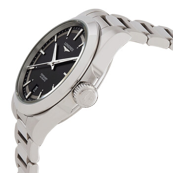 Silver-tone stainless steel case and bracelet. Fixed silver-tone stainless steel bezel. Black dial with silver-tone hands and index hour markers. Minute markers around the outer rim. Dial Type: Analog. Luminescent hands and markers. Date display at the 6 o'clock position. Longines Calibre L888 Automatic movement, based upon ETA A31.L11, containing 21 Jewels, bitting at 25200 vph, and has a power reserve of approximately 64 hours. Scratch resistant sapphire crystal. Screw down crown. Transparent see through case back. Round case shape, case size: 38 mm. Fold over clasp with a safety release. Water resistant at 100 meters / 330 feet. Functions: date, hour, minute, second. Conquest Series. Luxury watch style. Watch label: Swiss Made. Longines Conquest Automatic Black Dial Men's Watch L3.720.4.52.6.