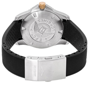 Stainless steel case with a black rubber strap. Uni-directional rotating yellow gold-plated bezel with a black ceramic ring. Black dial with yellow gold-tone hands and dot hour markers. Arabic numerals appear at the 6, 9 and 12 o'clock positions. Minute markers around the outer rim. Dial Type: Analog. Luminescent hands and markers. Date display at the 3 o'clock position. Longines calibre L888 automatic movement, based upon ETA A31.L11, containing 21 Jewels, bitting at 25200 vph, and has a power reserve of approximately 64 hours. Scratch resistant sapphire crystal. Screw down crown. Solid case back. Round case shape. Case size: 41 mm. Case thickness: 11.9 mm. Band width: 22 mm. Tang clasp. Water resistant at 300 meters / 1000 feet. Functions: date, hour, minute, second. Additional Info: original box, international warranty card, manual (complete accessories). Conquest Series. Luxury watch style. Watch label: Swiss Made. Longines Conquest Automatic Black Dial Men's Watch L3.781.3.56.9.