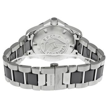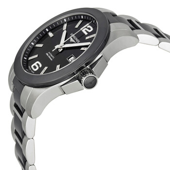 Stainless steel case with a stainless steel bracelet with black ceramic center links. Fixed black ceramic bezel. Black dial with silver-tone hands and index hour markers. Arabic numerals mark the 6 and 12 o'clock positions. Minute markers around the outer rim. Dial Type: Analog. Date display at the 3 o'clock position. Automatic movement with a 38 hour power reserve. Scratch resistant sapphire crystal. Screw down crown. Solid case back. Case diameter: 41 mm. Round case shape. Deployment clasp. Water resistant at 50 meters / 165 feet. Functions: date, hour, minute, second. Casual watch style