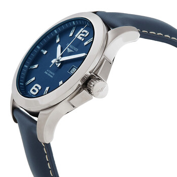 Silver-tone stainless steel case with a blue leather strap. Fixed stainless steel bezel. Blue dial with silver-tone hands and index-Arabic numerals hour markers. Dial Type: Analog. Date display at the 3 o'clock position. Longines Calibre L888 Automatic movement, based upon ETA A31.L11, containing 21 Jewels, bitting at 25200 vph, and has a power reserve of approximately 64 hours. Scratch resistant sapphire crystal. Screw down crown. Solid case back. Round case shape, case size: 41 mm, case thickness: 11.70 mm. Band width: 21 mm. Folding clasp. Water resistant at 300 meters / 1000 feet. Functions: date, hour, minute, second. Conquest Series. Casual watch style. Watch label: Swiss Made. Longines Conquest Automatic Blue Dial Men's Watch L3.777.4.99.0.