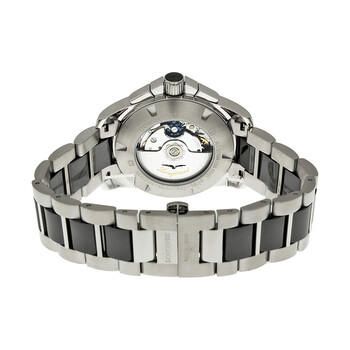 Stainless steel and ceramic case with a stainless steel and ceramic bracelet. Fixed with tachymeter bezel. Black dial with silver-tone hands and index hour markers. Arabic numeral marks the 12 o'clock position. minute markers around the outer rim. Dial Type: Analog. Luminescent hands and markers. Date display between 4 and 5 o'clock position. Chronograph - three sub-dials displaying: 60 second, 30 minute and 12 hour. Automatic movement. L688 engine. Scratch resistant sapphire crystal. Screw down crown. Transparent sapphire case back. Case diameter: 41 mm. Round case shape. Deployment clasp. Water resistant at 50 meters / 165 feet. Functions: chronograph, date, hour, minute, second, tachymeter. Luxury watch style. Watch label: Swiss Made. Longines Conquest Automatic Chronograph Black Dial Men's Watch L2.744.4.56.7.