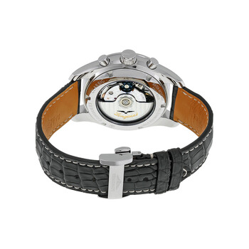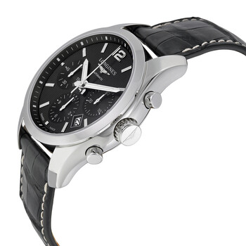 Stainless steel case with a black leather strap. Fixed stainless steel bezel. Black dial with silver-tone hands and index hour markers. An Arabic numeral appears at the 12 o'clock position. Minute markers around the outer rim. Dial Type: Analog. Luminescent hands and markers. Date display between the 4 and 5 o'clock positions. Chronograph - three sub-dials displaying: 60 second, 30 minute and 12 hour. Automatic movement with a 54 hour power reserve. Scratch resistant sapphire crystal. Screw down crown. Transparent case back. Case diameter: 41 mm. Round case shape. Fold over clasp. Water resistant at 50 meters / 165 feet. Functions: chronograph, date, hour, minute, second. Dress watch style. Watch label: Swiss Made. Longines Conquest Automatic Chronograph Black Dial Black Leather Watch L27864563.